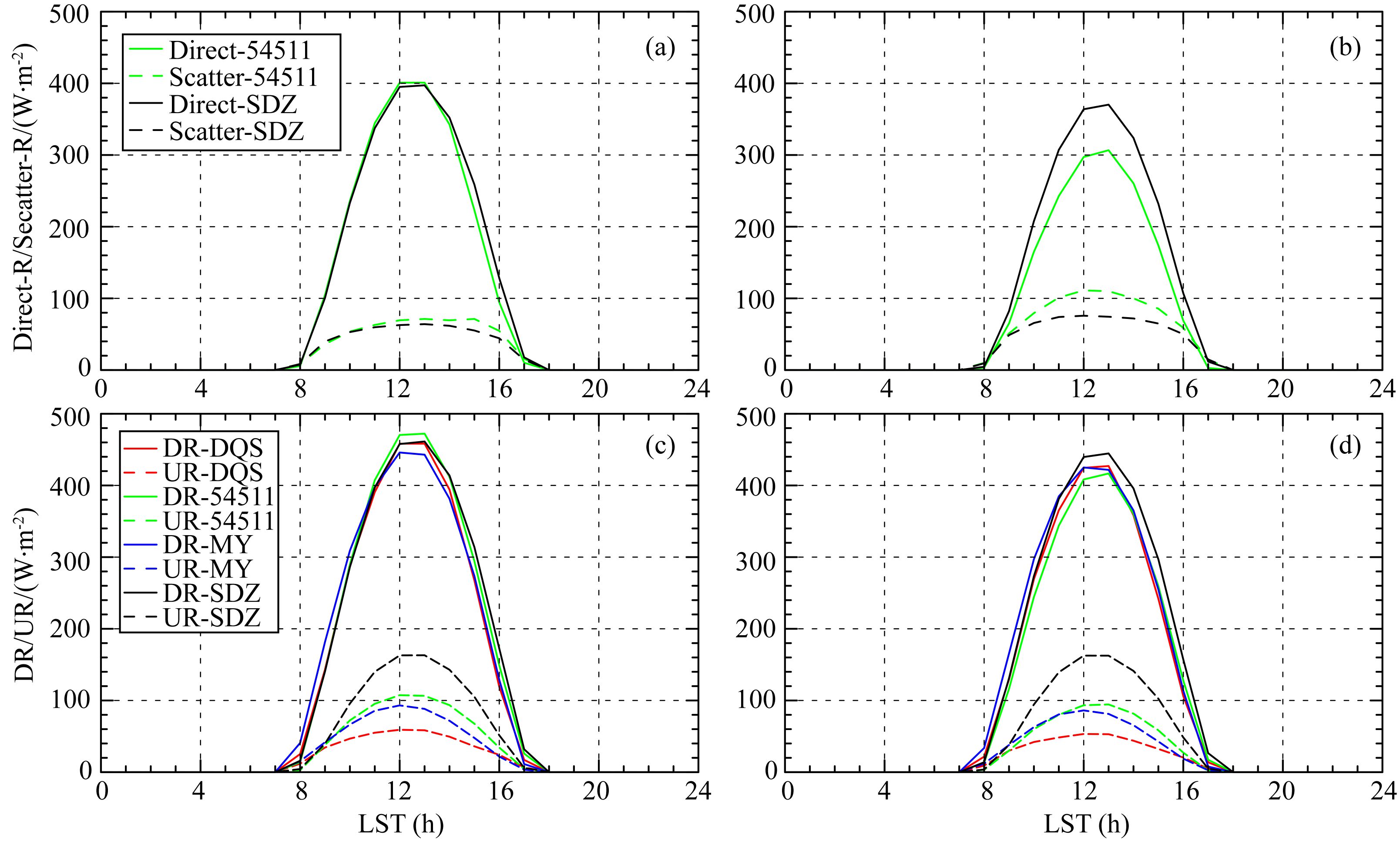 图 5 各站辐射分量的日变化对比 (a)清洁天直接辐射和散射辐射日变化;(b)污染天直接辐射和散射辐射日变化;(c)清洁天短波辐射日变化;(d)污染天短波辐射日变化.图中各符号含义同图 4和表 4. Fig. 5 Compare the diurnal variation of radiation components for each station (a)Diurnal variation of direct and diffuse radiation in clear days;(b)Diurnal variation of direct anddiffuse radiation in pollution days;(c)Diurnal variation of shortwave radiation in clear days;(d)Diurnal variation ofshortwave radiation in pollution days. The symbols are the same as in Fig. 4 and Table 4. |
