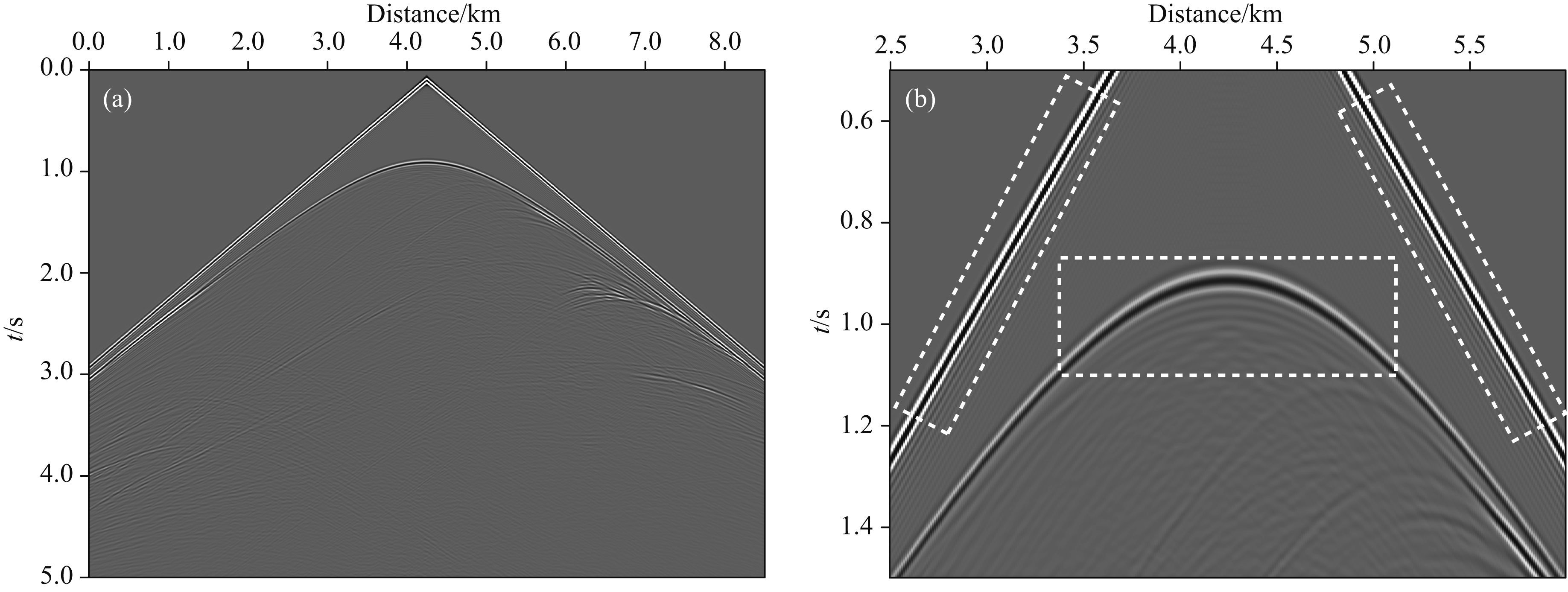 在正演模拟之前,先根据计算参数与速度值求取优化的差分系数(3373组),系数用时约6.25 s.然后利用得到的系数进行波场延拓,差分阶数M=4时,计算耗时约501.3 s;差分阶数M=6时,计算耗时约642.5 s.图 9a为传统方法采用差分阶数M=4得到的地震记录,其右侧(图 9b)为局部放大图,在虚线框中可以观察到明显的数值频散.增加差分阶数M=6,传统方法得到的地震记录如图 10a所示,为了便于比较,相应的局部放大图见图 10b;通过增加差分阶数,频散的得到了较好的压制.图 11a为本文方法M=4时对应的地震记录,其局部放大图见图 11b.对比局部放大图,采用本文方法M=4时得到的地震记录的精度与传统方法M=6时得到精度相当.本文方法时间(包括差分求取时间)约为传统方法所耗时间的0.78.