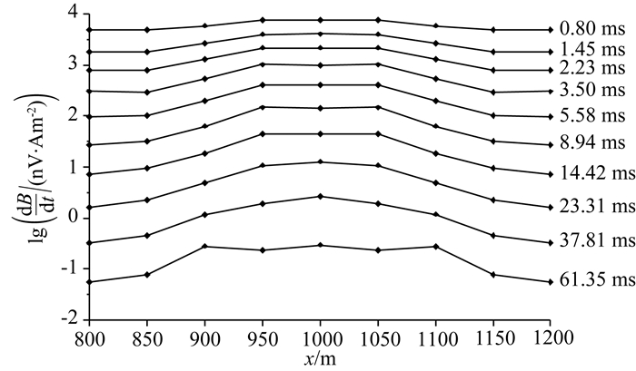 图 7是主测线瞬变电磁响应多道剖面图,为直观地分析深海热液硫化物矿的瞬变电磁响应特征,取81个测点不同时间道的响应值绘制3D瞬变电磁响应图,如图 8所示.