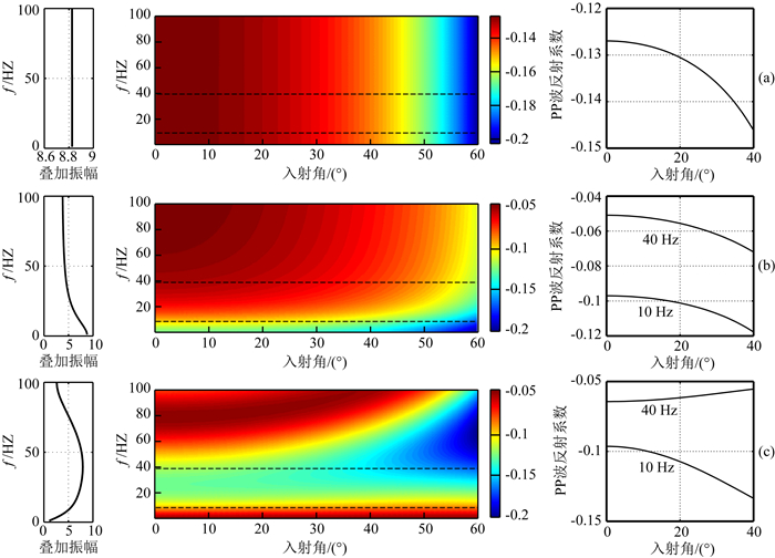 ![]() | 图 5 PP波反射系数实部(中间列)、0~60°叠加振幅(左列)、10 Hz与40 Hz的AVO曲线(右列) (a)页岩-弹性砂岩界面; (b)页岩-非弹性砂岩界面; (c)15 m厚非弹性薄层砂岩. Fig. 5 Real parts of PP reflection coefficients (middle), stacked amplitudes (left), and AVO curves for 40 Hz and 40 Hz (right) (a) Shale-elastic sandstone interface; (b) Shale-inelastic sandstone interface ;(c) Thin layer of inelastic sandstone. |
