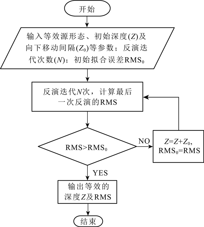 2 方法及理论计算方法的总体思路是在观测剖面下方某一深度均匀布置一层等效场源,采用物性反演得到等效源物性参数.等效源层以一定的间隔从浅部向深部移动,每移动一次进行固定次数的迭代反演,求得每一深度的反演拟合差.在等效源层由浅变深的过程中,拟合差通常由大变小,直到等效源层到达实际场源中心位置时拟合差最小;当拟合差最小或显著增大时,等效源层停止移动,反演结束,此时等效源层的深度即视为实际场源的深度.可以根据异常特征及实际需求选取不同的移动间隔,设置的间隔越小,等效源向下移动的次数越多,所需的计算时间越长,计算流程见图 1.