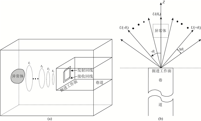 3.2 矿井瞬变电磁超前探测合成孔径成像原理和方法矿井瞬变电磁法超前探测的地点是在巷道掘进工作面处,如图 2a所示,图中矩形小回线源紧靠掘进工作面掌子面上,虚线圆圈代表掘进工作面前方瞬变电磁一次场不同时刻的“烟圈”.常采用扇形布置,即在掘进工作面位置放置小线框天线,以巷道正前方为中心轴,按一定的角度(10°或15°)往两帮分别进行不同方向探测,最终形成扇形探测断面,如图 2b所示,图中箭头表示同一断面上不同的探测方向(发射线框的法线方向),虚线框表示掘进工作面前方的异常体,设掘进工作面正前方为z轴,z轴所指方向为0°,用与z轴所夹的角度θ来定义探测方向(z轴左侧的角度为负,右侧的角度为正),即:U(-θi)表示z轴左侧与z轴成θi角度方向上的实测信号值,U(+θi)表示z轴右侧与z轴成θi角度方向上的实测信号值,U(θ0)表示z轴方向上的实测信号值.