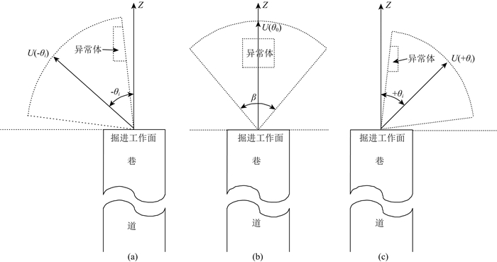 ![]() | 图 3 矿井瞬变电磁超前探测合成孔径原理 (a) 方向-θi上的单次探测; (b) 方向θ0上的单次探测; (c) 方向θi上的单次探测. Fig. 3 Principle ofsynthetic aperture schematicof advanced detection in roadway (a) Detection in the direction of -θi; (b) Detection in the direction of θ0; (c) Detection in the direction of θi. |