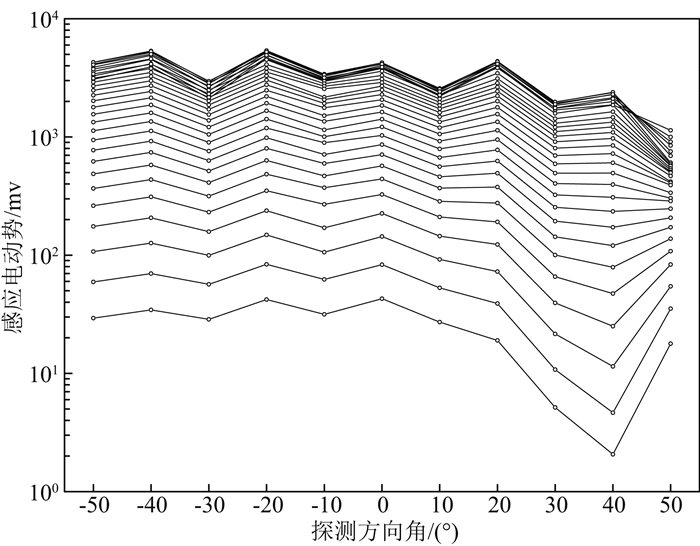 图 4是G22+5 m探测点水平断面11个方向(以巷道掘进方向为0°,往左帮每隔10°一个探测方向,到左帮50°,往右帮每隔10°一个探测方向,到右帮50°)的实测感应电动势曲线图,图中曲线表示不同探测方向上相同时间门间的连线.
