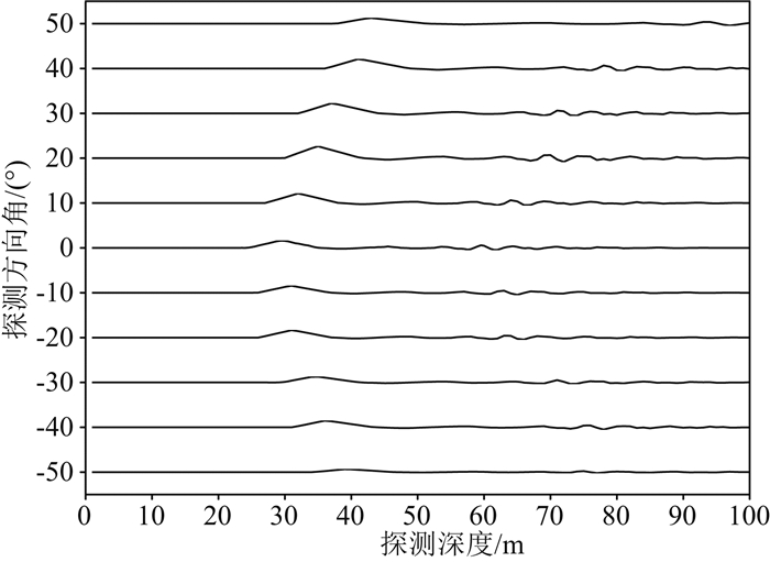 对比该断面合成孔径前(图 5)与合成孔径后(图 6)拟地震信号波形图,合成孔径之后的波形图在相关性较好的探测方向较合成孔径之前的信号得到了明显加强,如在相关性较好的-20°探测方向到+20°探测方向间的探测数据,合成孔径前的两处曲线幅值较为平缓,但合成孔径后,波形幅值增大,信号得到了显著增强,并且波形宽度未发生变化;而在相关性相对较差的-50°探测方向以及50°探测方向,合成孔径前曲线幅值较为平缓,在合成孔径后,波形幅值被削弱;其他探测方向合成孔径后波场曲线幅值得到了不同程度的加强.整体而言,各个探测方向上有意义的弱异常得到了加强,信噪比得到了提高,合成孔径效果比较显著.