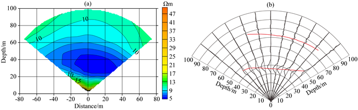 ![]() | 图 7 合成孔径成像断面与常规视电阻率扇形断面对比 (a) 常规视电阻率断面; (b) 合成孔径成像断面.Fig. 7 Comparison ofgeneral resistivity section (a) and SAI section (b) |