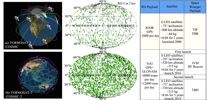 ![]() | 图 15 COSMIC(上面)与COSMIC-2(下面)的相关比较:最左列:卫星轨道覆盖比较;中间列:掩星事件在3 h内的全球分布;最右列:卫星及载荷相关基本参数.最左列图片来源于NSPO Fig. 15 Comparison between COSMIC (up panels) and COSMIC-2 (bottom panels). Left: satellite orbits (Image Credit: NSPO); Middle: Occultation events distribution in 3 hours; Right: parameters of satellites and payloads |