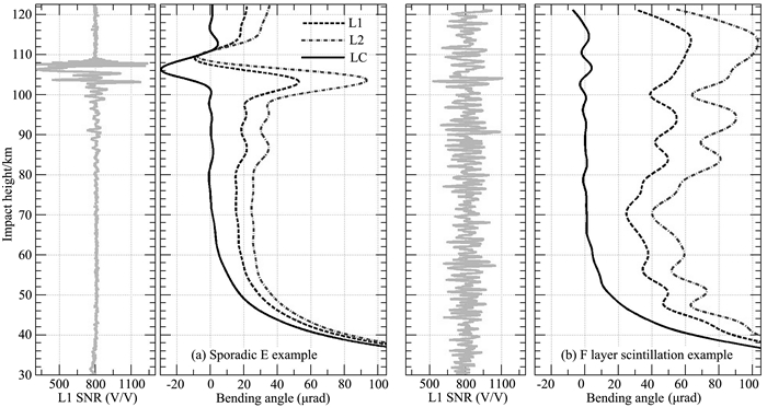 ![]() | 图 17 存在扩展E层(a)和F层不均匀体(b)时对应的信噪比和弯曲角个例:左边:L1 SNR;右边:相应的L1(--)/L2(-.)弯曲角及线性组合后的中性大气弯曲角(-).两个个例均来自COSMIC观测 Fig. 17 Example of occultations with sporadic E (a) and F region scintillation (b) occurrence. Left: L1 SNR; Right: bending angle of L1 (--), L2 (-.), and ionosphere free atmosphere (-). Both examples are observed by COSMIC |