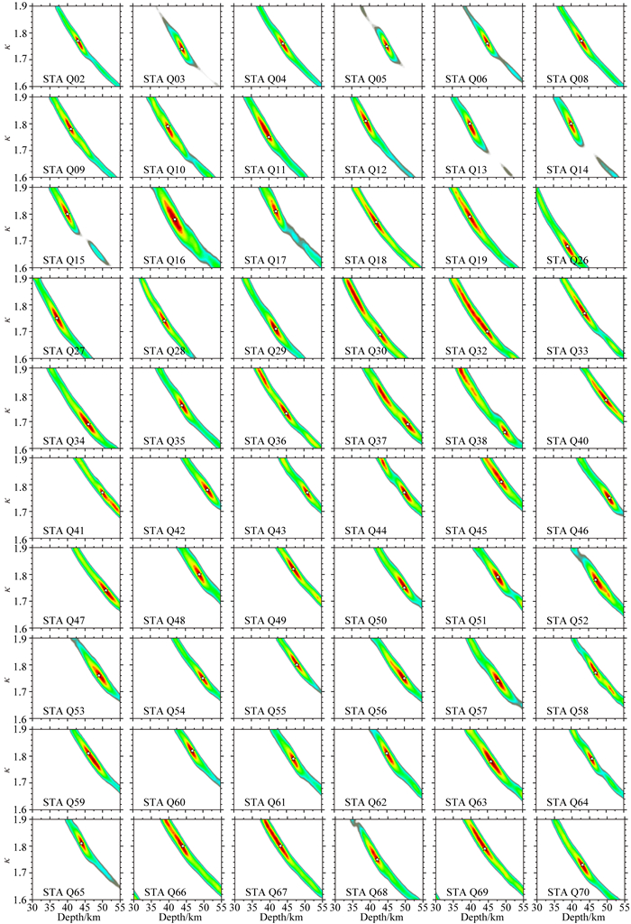 ![]() | 图 5 通过H-κ叠加估计的各台站的地壳厚度H和地壳纵、横波速度比VP/VS(κ) Fig. 5 Crustal thickness H and velocity ratio VP/VS(κ) of stations estimated by the H-κ stacking methods |