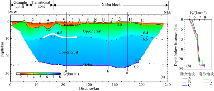 (1)OBS2013-3测线广乐隆起段(0~30 km)沉积层厚度约为0.5~2.7 km,西沙地块(70~240 km)的沉积层厚度约为0.8~3.0 km,两者过渡区域(30~70 km)沉积基底变化较大,上地壳与沉积层速度偏高,厚度变化较大(图 10);在OBS06、07、08这3个台站中识别出康拉德面的反射震相(PcP)(图 8),很好地约束了地壳结构中上、下地壳的分界;西沙地块上下地壳厚度比接近1 : 2,广乐隆起接近1 : 1;西沙地块地壳厚度较为稳定,平均约为23 km,Moho界面埋深23~27 km,上地幔速度为8.0 km·s-1(图 10a).