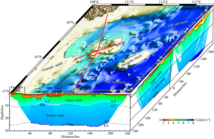 OBS2011海陆联合深地震测线通过琛航地震台沿NW-SE方向横穿西沙地块,我们将OBS2011测线与NE-SW向的广乐隆起—西北次海盆地壳结构大剖面综合在一起,构制横穿西沙地块的假三维结构模型(图 12).琛航地震台位于两个大剖面的交点,相当于OBS2013-3测线中OBS08台站的位置,距石岛地震台西南80 km处(图 2),其下方的地壳厚度为24 km,莫霍面埋深为26 km(图 10a);黄海波等(2011)利用天然地震接收函数方法及海底地震仪探测相结合的方法,获得琛航台站下方的地壳厚度为26~28 km,和石岛台附近相似,同样是S波确定的莫霍面深度大于P波探测的莫霍面深度,再次推断是下地壳或上地幔存在部分熔融的结果.