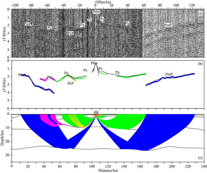 ![]() | 图 6 OBS08台站地震记录剖面及射线追踪,其他同图 3Fig. 6 Ray tracing and travel times simulation for OBS08 along the profile OBS2013-3. Other legends are the same as Fig. 3 |