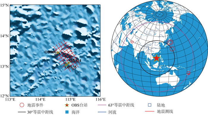 ![]() | 图 1 南海西南次海盆3D海底地震仪探测测线布置及地震事件的分布 Fig. 1 Layout of 3D seismic array of OBS at southwestern subbasin in the SCS and distribution of seismic events |
