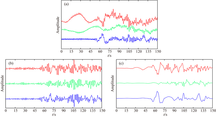 图 2 s傅里叶变换滤波和小波变换滤波对比 红线为径向分量,绿线为切向分量,蓝线为垂向分量. (a) 原始ZRT三分量地震记录; (b) 傅里叶变换滤波后的结果; (c)傅里叶变换滤波联合小波变换处理的结果. Fig. 2 Comparison between Fourier transform filtering and wavelet transform filtering Red line is R component, green line is T component and blue line is Z component. (a) Original ZRT three components data; (b) Results of Fourier transform filtering; (c) Results of wavelet transform filtering. |