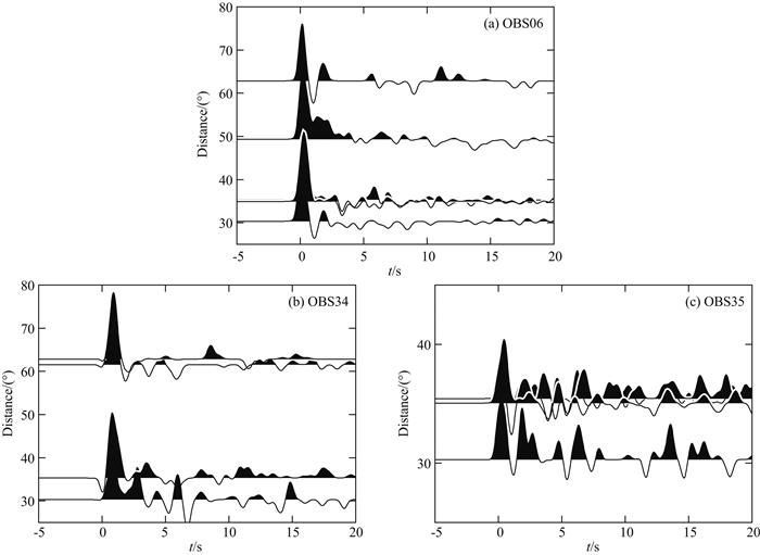 经上述方法我们从OBS实测数据中提取了接收函数(图 3).从中可以直观地分辨出P-s转换波震相,且P-s震相出现在直达P波后几秒之内,反映了洋壳相对较小的厚度.我们发现同一台站由各地震事件求取的接收函数有较好的一致性,但个别事件有较大差异(在后续反演中不予采用).其原因可能是各次远震的震源深度、路径、震级大小都不相同,且地震波到达台站时本身带有较大而复杂的随机噪声和路径的非均匀性,这个问题还有待于今后进一步研究.由于存在个别差异较大的接收函数,在反演过程中分别对单个接收函数和叠加后的接收函数做反演,然后筛选出其中接收函数拟合程度最高,相似性较高的反演模型作最后的结果.