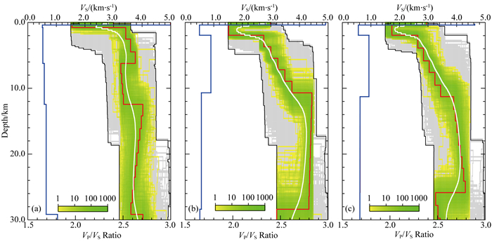 图 4 相邻算法生成最佳的1000个S波速度模型密度图 灰色影区为低密度区域,S波速度可信度较低,黄色影区次之,绿色影区最好.红色实线为最佳速度模型;白色实线为平均速度;蓝色实线为波速比.(a)、(b)和(c)分别为OBS06、OBS34和OBS35台站下方S波速度模型. Fig. 4 Density diagram of the best 1000 S velocity models generated by the NA code The gray area shows low density and low reliability, yellow area has a better fitting, and green area has the best result. The red solid line is the best S-wave velocity curve. The white solid line is the average S-wave velocity curve. The blue solid line represents VP/VS ratio. Models (a), (b) and (c) are stations OBS06, OBS34 and OBS35, respectively. |