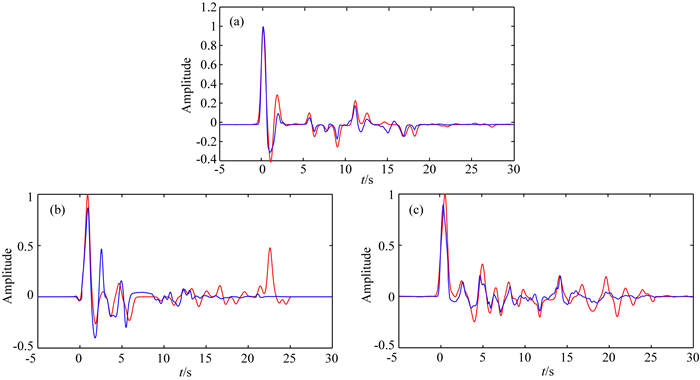 图 5 实测接收函数和拟合接收函数对比 红线为实测接收函数,蓝线为拟合接收函数.(a)、(b)和(c)分别为OBS06、OBS34和OBS35台站接收函数对比. Fig. 5 Comparison between observed receiver function and predicted receiver function Red solid line is observed receiver function and blue solid line is predicted receiver function. (a),(b) and (c) are results of OBS06,OBS34 and OBS35, respectively. |