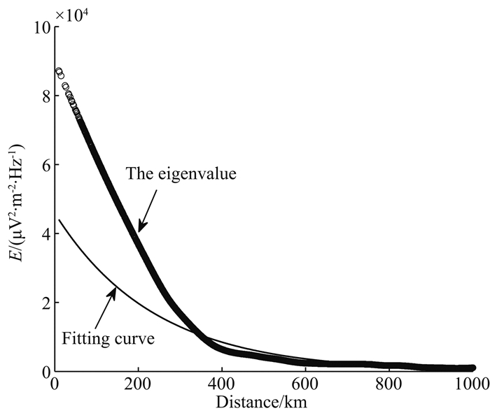 3.4 VLF电场中心点强度随距离变化VLF电磁波在电离层传播过程由于低电离层的反射和等离子体碰撞吸收会产生能量的衰减(Bell and Ngo,1990;Lehtinen and Inan,2009;赵庶凡等,2011).以往的研究使用已知功率的发射站,利用卫星观测和地面观测的电磁波对比来确定电离层电磁波传播系数(Chapman et al.,1966;Tomko and Hepner,2001).Devi等(2008)通过地-电离层波导模式分析了甚低频(16 kHz)电磁波长距离(8 Mm)的传播特性.本文利用卫星观测的VLF(19.8 kHz)电磁波,采用指数函数(y=aebx)拟合的方法来分析VLF电磁波在空间的衰减特性.考虑到VLF电场中心点的分布特征,采用每一年VLF电场中心点强度前20位最大值的均值作为该年VLF电场中心点的场强,前20位最大值所对应坐标的均值作为该年VLF电场中心点坐标,VLF电场(南半球)中心10°(1000 km)作为研究范围.VLF电场10°范围内测点随距离的分布如图 5所示(以2005年为例),利用指数函数(y=aebx)拟合测点随距离的分布如图 6所示.