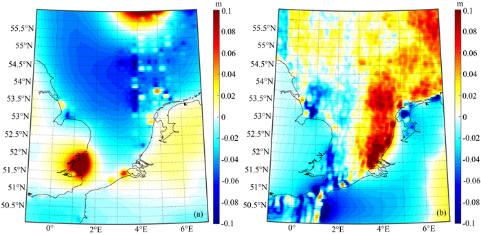 引入卫星测高数据时,其数据类型可为沿轨垂线偏差或者大地水准面高高差.为了选择合适的数学模型,分别使用沿轨垂线偏差和大地水准面高高差构建局部区域的大地水准面,利用高精度的控制数据评价基于不同数据类型构建的大地水准面的精度.试算区域Ω覆盖荷兰、比利时以及部分德国、法国和北海区域,其纬度范围为49°—56°,经度范围为-1°—7°.建模数据包括陆地重力异常、船载重力异常、航空重力扰动和不同类型的测高数据,计算沿轨垂线偏差或者大地水准面高高差时采用DCSM模型移去动态海面地形的影响.图 7显示了分别利用沿轨垂线偏差和大地水准面高高差解算的大地水准面的差异,在英国东南部及其沿海区域、北海东部区域差异较大,局部区域可达厘米级或以上.两者差异的主要原因在于采用沿轨大地水准面坡度近似逼近垂线偏差可能会引入误差,基于的垂线偏差解算得到的大地水准面的误差较大.另一方面,在上述差异较大的海域区域,由于缺乏船载重力数据,测高数据在该区域大地水准面的确定中占主导作用,差异显得尤为明显.在其他区域,由于有较为密集的船载重力数据,一定程度上弥补了沿轨垂线偏差的不准确性引入的误差.表 4显示了利用不同参考数据对大地水准面的外部检核结果(以计算的和观测的大地水准面高的差异的标准差作为精度指标),海域区域由于缺乏高精度的控制数据,采用欧洲大地水准面模型EGG08为参考模型,而陆地上采用不同区域的GPS水准数据.结果表明:较之于基于沿轨垂线偏差计算的大地水准面模型,利用沿轨大地水准面高高差计算得到的解的精度较高,在荷兰、比利时和英国区域,其精度分别提高了约0.34 cm、0.27 cm和1.4 cm;而在相关海域区域,大地水准面的精度提高了约2.3 cm.值得注意的是,测高数据不仅影响到海域大地水准面的确定,也会影响到近海区域陆地大地水准面的解算,见图 7中英国、荷兰、比利时的陆地近海区域.基于上述结论,后续的计算中采图 5(a)DCSM模型计算的动态海面地形;(b)DCSM及GOT4.7模型计算的动态海面地形的差异用沿轨大地水准面高高差作为测高观测量.