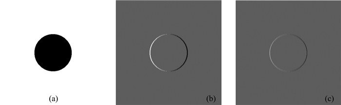 其中Hp(x)=(-1)pex2(d/dx)pe-x2是p阶Hermite多项式,通过参数μ来控制拉伸程度.当μ=1时,高斯项退化为无方向性,即经典的HGFs.HGFs函数简单,用起来较为方便,然而由于其无方向性的局限,滤波时对各个方向均进行平滑作用,降低了检测精度.E-HGFs凭借其高方向性,一方面克服了折中检测效果和定位精度的Canny(1986)局限,另一方面可以通过分析不同方向的响应来区分噪声和感兴趣的特征,应用前景更为广泛.图 3为圆盘的滤波效果(此图引用Papari(2012)文献中Fig. 2),(c)中响应只在垂直方向的中间位置有较大值,很好地展示了E-HGFs对方向定位的高精确度.