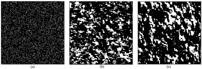 ![]() | 图 7 二维数字岩心建模结果对比 (a) 完全随机的模型; (b) 第一阶段建模结果; (c) 第二阶段建模结果. Fig. 7 Comparison chart of 2D digital core modeling results (a) Completely random model; (b) Modeling results from the first stage; (c) Modeling results from the second stage. |