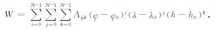 式中W表示任意磁场要素;N为截断阶数;φ,λ为各地磁测点的纬度和经度;φ0,λ0为多项式的展开原点的纬度和经度,Aij为相应各分量的模型系数,每个模型有N(N+1)/2个系数,所有系数通过最小二乘法求取.