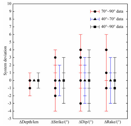 图 6 不同震中距范围的SH波重抽样反演偏差结果 采用fk_CMB合成地震图作为输入数据(输入震源参数参照表1),fk_noCMB格林函数进行反演.黑色圆形、三角形及方块图标分别为震中距70°~90°、40°~70°、40°~90°数据Jackknifing系统偏差值,不同颜色的线段分别表示其反演偏差可达范围. Fig. 6 Deviations of different epicentral distance ranges in SH wave inversions Using fk_CMB synthetic seismograms as the input data (The type of focal mechanism and the input source parameters are same in Table 1),while using fk_noCMB green′s function waveforms to invert the best fit solution of depth, strike, dip and rake in CAPtel. Circle, triangle and diamond respectively represent systematic deviations of epicentral distance ranges in 70°~90°, 40°~70°, 40°~90° of Jackknifing results, while the red, blue and black lines show t he relevant maximum deviations. |