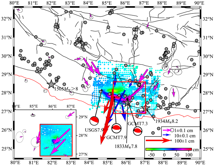 图 1主图部分显示MW7.9主震引起的33个GPS站点同震水平位移,符合逆冲断层破裂的形变特征,位移矢量从南北两侧指向震中.GPS站最大位移1.89 m发生在尼泊尔境内距主震GCMT震中仅9.5 km的KKN4站.尼泊尔境内距离震中约50 km的两个测站观测到1.3~1.5 m的同震位移.在藏南地区,GPS最大位移54 cm处在毗邻尼泊尔的聂拉木县J041区域站.距离震中约140 km的吉隆县J040和J339两个区域站位移约13~15 cm.离开震中约243 km的仲巴和昂仁位移约2 cm.距离震中400 km以外的其他测站同震形变一般小于5 mm.图 1内插图则显示尼泊尔和藏南地区GPS站(约25点)MW7.3级余震同震位移,在震中北东方向至我国珠峰测站之间产生2 cm以上的变形,影响范围在200 km左右.