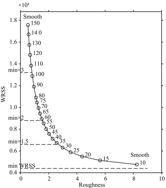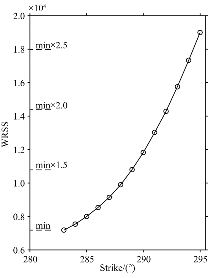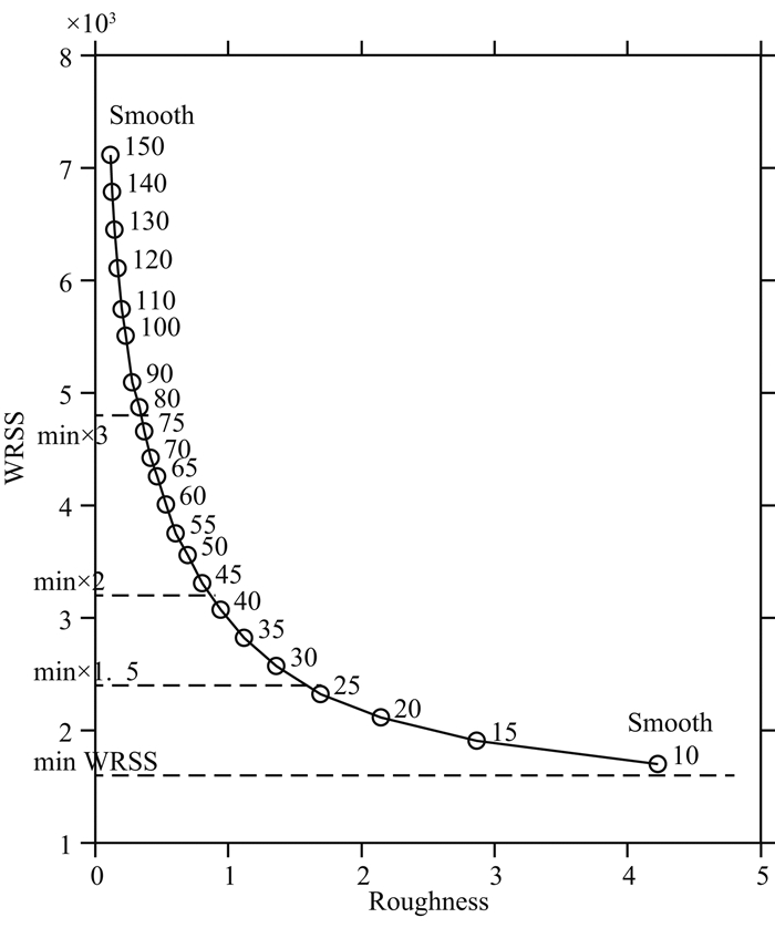 图 6 MW7.3余震观测值不符值和滑动粗糙度的折衷曲线 曲线右侧的数值是平滑因子,纵坐标轴上的虚线标出了最小不符值min WRSS位置、以及1.5倍、2倍和3倍最小不符值位置. Fig. 6 Trade-off curve of observation misfit WRSS vs. slip roughness of the MW7.3 aftershock The smoothing factors are labelled along the curve and the WRSS minimum and 1.5,2 and 3 times values are indicated by dashed lines. |