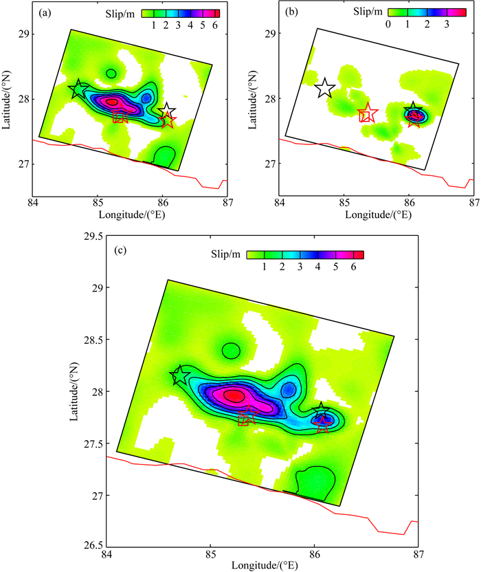 图 4 MW7.9主震和MW7.3余震在弹性分层和横向差异地壳中的同震滑动分布模型 (a)MW7.9主震滑动分布;(b)MW7.3余震滑动分布;(c)总滑动分布.黑五角星:USGS震中; 红五角星:GCMT震中; 滑动量等值线:1~6 m; 小红方框:加德满都; 红曲线:喜马拉雅主前缘逆冲断裂(Styron et al.,2011). Fig. 4 Coseismic slip distributions in a multi-layered and laterally heterogeneous brittle crust associated with the MW7.9 main shock and MW7.3 aftershock respectively (a)The MW7.9 main shock;(b)The MW7.3 aftershock;(c)Combined slip. Black star: USGS epicenter; red star: GCMT epicenter; slip contour line:1~6 m; little red square: Kathmandu; red curve: the Main Frontal Fault(Styron et al.,2011). |