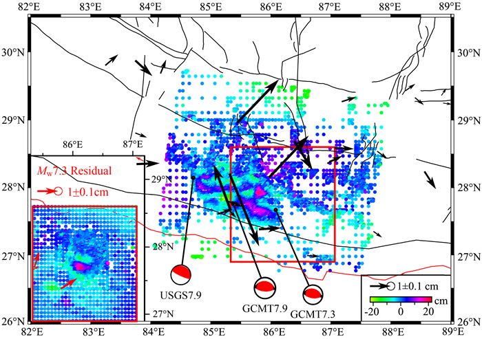 黑箭头:MW7.9 GPS形变拟合残差; 红箭头:MW7.3 GPS形变拟合残差;颜色点:InSAR LOS形变值拟合残差; 红色矩形框:MW7.3地震InSAR观测区;左下角小图:MW7.3观测值残差. Fig. 5 Postfit residuals of GPS displacements and InSAR range offsets Arrows: GPS residuals; Coloured dots: InSAR residuals; Rectangle: InSAR coverage for the MW7.3 aftershock; The main figure shows the mainshock and the left lower inset displays the MW7.3 aftershock. |