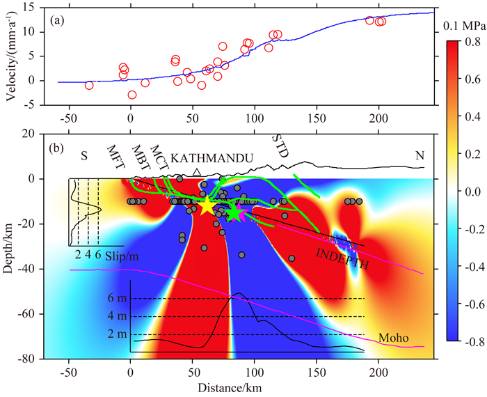 图 8 尼泊尔地震破裂剖面、库仑应力变化、INDEPTH剖面 (a)垂直于断裂方向的震间GPS水平速度剖面.红色小圈:垂直于断裂方向的GPS点水平速度;蓝色曲线:震间速度模型曲线(赵斌等,2015b).(b)垂直于断裂方向的破裂剖面.MFT:主前缘逆冲断裂;MBT:主边界逆冲断裂;MCT:主中央逆冲断裂;STD:藏南拆离层;从MFT往北延伸的黑线:本文断裂剖面;其下方和左侧的曲线:沿剖面的主震和余震总的最大滑动量;下方绿色的五角星:USGS震中;上方黄色的五角星:GCMT震中;下方品红色五角星:USGS定位的MW7.3余震;库仑应力是MW7.9主震引起的库仑应力,计算深度:10 km,接收断层走向285°,倾角9°,滑动角90°,摩擦系数0.8. Fig. 8 Slip distribution,Coulomb stress and aftershocks distribution of the Nepal earthquake across the profile (a)Interseismic GPS horizontal velocity profile across the Himalaya.Red circle: GPS horizontal velocity across the Himalaya; blue line: interseismic dislocation model.(b)Rupture along a profile across the Himalaya. MFT: Main Frontal Thrust; MBT: Main Boundary Thrust; MCT: Main Central.Thrust; STD:Southern Tibet Detachment; thick black line extending from MFT: the rupture along a profile inferred from this paper; the bottom curve and the left curve: the maximum of total slip; green star: USGS epicenter; yellow star:GCMT epicentre; magenta star:USGS epicentre of the MW7.3 aftershock; the Coulomb stress were caused by the MW7.9 main shock at depth of 10 km,the receive fault is assumed striking 285°,diping 9° with a rake of 90°.The friction coefficient 0.8 is used. |