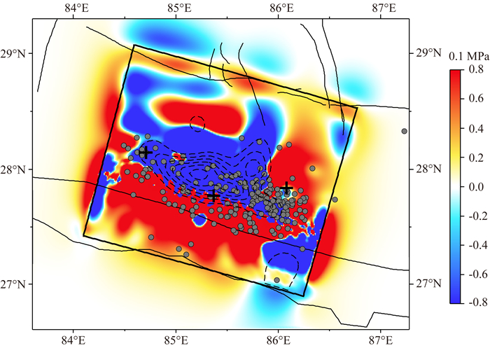 图 9 尼泊尔MW7.9主震库仑应力与余震分布(库仑应力接收断层走向285°) 库仑应力是MW7.9主震库仑应力,计算深度10 km; 接收断层走向285°,倾角9°,滑动角90°,摩擦系数0.8; 灰色圆点:所有3级以上的余震; 虚线曲线:主震滑动量为1~6 m的等值线; Fig. 9 The MW7.9 mainshock Coulomb stress and the aftershocks distribution The Coulomb stress were caused by MW7.9 main shock at depth 10 km,the receive fault striking 285°,diping 9°,rake 90°,friction coefficient 0.8; gray dots: >M3 aftershocks; dashed curve: 1~6 m slip contour lines of the main shock; black plus:USGS main shock epicentre,GCMT main shock epicentre; USGS aftershock epicentre. |