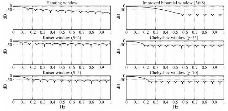 图 1是不同窗函数在N=24时的时间域展布,图 2为各窗函数的幅值响应.从图中可以发现,当时间域窗函数系数变化率较高时,其幅值响应有着更宽的主瓣,而窗函数尾端曲率越大,则旁瓣衰减越明显.在图 1所示各种窗函数中,改进二项式窗系数有着最快的下降速率,也对应了最宽的主瓣范围,但也拥有最大的旁瓣衰减.对于Chebyshev窗,当参数γ增大时,其主瓣将变宽缓,旁瓣衰减变大.Kaiser窗与Chebyshev窗有着类似的性质.