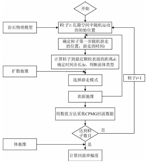 随机游走方法通过模拟大量粒子的布朗运动求解方程(1) 来实现流体磁化强度衰减的模拟.由(4) 式可知,模拟NMR信号强度的衰减可以通过分别模拟体弛豫信号强度、表面弛豫信号强度和扩散弛豫信号强度的衰减来实现,其对应的方法步骤如图 1所示.