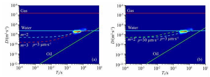 4.2 影响因素分析流体受限扩散系数线的位置不是一成不变的,它与很多因素有关,例如岩石胶结指数和表面弛豫率等.下面具体讨论岩石胶结指数m和表面弛豫率ρ对水的受限扩散系数线的影响.图 10a中蓝色虚线和红色虚线分别代表m=2、ρ=3 μm·s-1及m=3、ρ=3 μm·s-1时水的受限扩散系数线,从图中可以看出,当T2较小时,胶结指数m对孔隙中润湿相流体(水)受限扩散系数线位置的影响占主导地位,且胶结指数m越大,受限扩散越显著,流体受限扩散系数线偏离自由扩散系数线越远.这是因为岩石胶结指数m越大,孔隙结构越复杂,孔隙网络弯曲度越大,粒子扩散过程中与岩石颗粒发生碰撞的概率就会越大,岩石孔隙中流体受限扩散就会越明显.图 10b中绿色虚线和蓝色虚线分别代表m=2、ρ=30 μm·s-1及m=2、ρ= 3 μm·s-1时水的受限扩散系数线,从图中可以看出,当胶结指数m一定时,即岩石孔隙结构一定,随着T2的逐渐增加,岩石表面弛豫率ρ不同,孔隙中润湿相流体(水)受限扩散系数线的位置不同,表现为表面弛豫率ρ越小,水的受限扩散系数线偏离自由扩散系数线越远.