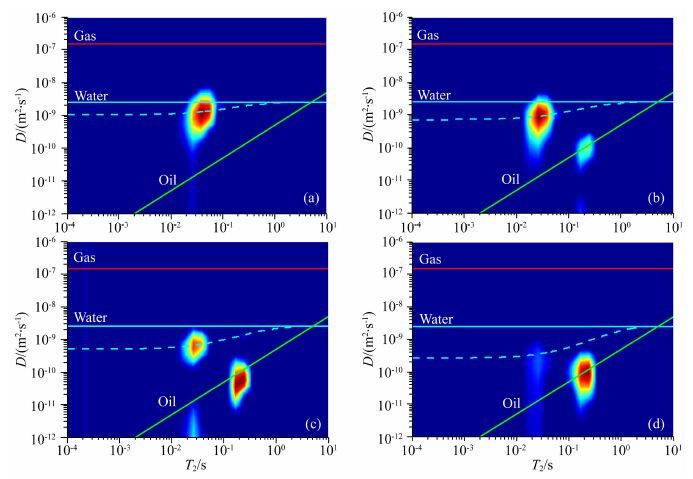 图 11 砂岩D\|T2分布中水信号的识别 (a)含水饱和度为100%的砂岩;(b)含水饱和度为75%和含油饱和度25%的砂岩;(c)含水饱和度为50%和含油饱和度50%的砂岩;(d)含水饱和度25%和含油饱和度75%的砂岩. Fig. 11 Water signal identification in D\|T2 distributions of sandstone (a)Sandstone saturated with 100% water;(b)Sandstone saturated with 75% water and 25% oil;(c)Sandstone saturated with 50% water and 50% oil;(d)Sandstone saturated with 25% water and 75% oil. |