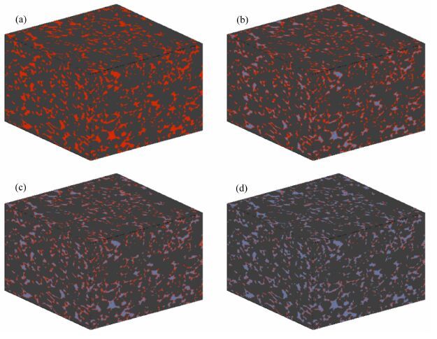图 4 砂岩数字岩心模型 (a)含水饱和度为100%的砂岩;(b)含水饱和度75%和含油饱和度25%的砂岩;(c)含水饱和度50%和含油饱和度50%的砂岩;(d)含水饱和度25%和含油饱和度75%的砂岩. Fig. 4 Digital core models of sandstone (a)Sandstone saturated with 100% water;(b)Sandstone saturated with 75% water and 25% oil;(c)Sandstone saturated with 50% water and 50% oil;(d)Sandstone saturated with 25% water and 75% oil. |