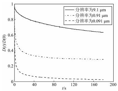 在0.3 T·m-1的梯度场中,用随机游走方法模拟了不同分辨率下砂岩中水的扩散系数随扩散时间的变化,如图 5所示.从图中可以看出:(1) 随着扩散时间的增加,砂岩中水的扩散系数逐渐减小,并趋于定值,该定值随着分辨率的提高逐渐减小;(2)经过相同的扩散时间后,随着分辨率的提高(砂岩孔隙尺寸逐渐减小),孔隙流体扩散系数逐渐减小,即受限扩散现象越明显.