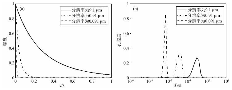 用随机游走方法模拟了回波间隔TE=0.6 ms时不同分辨率情形下砂岩在0.3 T·m-1的梯度场下的CPMG自旋回波串,如图 6a所示,随着分辨率的提高,砂岩完全饱和水时回波串幅度衰减加快.利用奇异值分解法(Dunn and Latorraca,1999)分别对图 6a中的回波串反演得到各自的T2分布,如图 6b所示,随着分辨率的提高,砂岩完全饱和水时T2分布的峰值对应的T2值逐渐减小,说明砂岩孔隙尺寸越来越小.