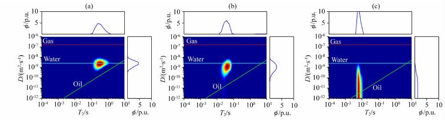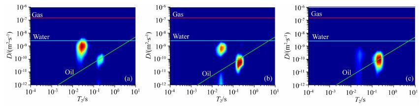 图 8 砂岩不同含水饱和度时D\|T2分布(分辨率为0.91 μm) (a)含水饱和度75%和含油饱和度25%的砂岩;(b)含水饱和度50%和含油饱和度50%的砂岩;(c)含水饱和度25%和含油饱和度75%的砂岩. Fig. 8 D\|T2 distributions of the sandstone with different water saturation(resolution of 0.91 μm) (a)Sandstone saturated with 75% water and 25% oil;(b)Sandstone saturated with 50% water and 50% oil; (c)Sandstone saturated with 25% water and 75% oil. |