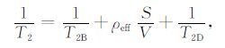 岩石孔隙中的流体横向弛豫过程受体弛豫、表面弛豫和扩散弛豫三种机理的作用,孔隙流体的横向弛豫时间T2可表示为