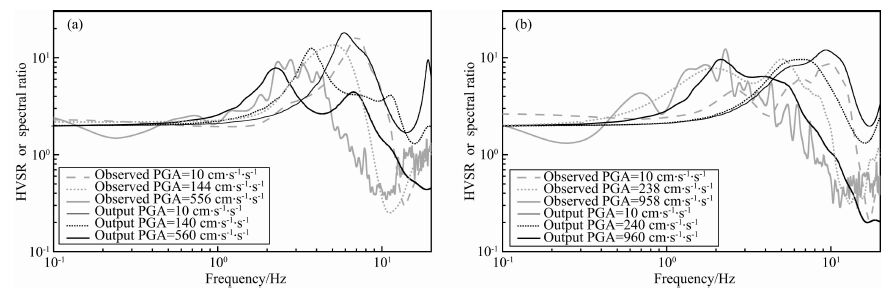 图 10 中国西部51SFB台站场地(a)与51WCW台站场地(b)的HVSR(灰色线)与一维等效线性化方法得到的传递函数曲线(黑色线)的比较(Rong et al.,2016) Fig. 10 Comparison of the HVSRs(grey lines)of S-wave motions and transfer functions(black lines)of S-waves from 1-D equivalent-linear models at several PGA levels for stations 51SFB(a)and 51WCW(b)(Rong et al.,2016) |