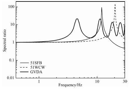 第3节中对于多个强震观测事件开展的HVSR与TF的比较研究已经表明了HVSR具有类传递函数效应,HVSR曲线能准确确定场地的卓越频率,但其幅值仍与TF曲线有一定差异,差异即为竖向场地效应.这一研究结论已经明确证实了HVSR方法的两条基本假定之一,即“假定覆盖土层对地震动中的竖向分量不放大”是不适用于GVDA场地的,而已有研究者(Rong et al.,2016)对中国西部多个强震台站的HVSR与传递函数的比较研究却表明,利用基于小震(场地近似处于弹性状态)的HVSR反演得到场地速度结构后,无论在线性还是较大非线性的情形下,基于观测的HVSR在幅值和谱形上均与TF曲线吻合较好.如图 10中给出的中国西部51SFB台站场地与51WCW台站场地HVSR与一维等效线性化方法得到的TF曲线较为吻合,其中两个台站场地等效线性化计算依据的土层模型为根据实测钻孔模型、波速延拓经验关系等(喻畑和李小军,2015)得到的等效反演模型(Rong et al.,2016).这一研究结论似乎表明对这两个场地,竖向场地效应虽造成HVSR与TF之间频谱的差异,但对幅值的影响不大.本文研究与已有研究(Rong et al.,2016)结论的差异表明,不同场地的竖向放大效应可能存在较大差异,才导致有的场地(如中国西部51SFB、51WCW台站场地)HVSR较为接近传递函数,有的场地(如本文GVDA场地)HVSR与传递函数则有较大差异.为揭示不同场地竖向放大效应的差异,本文依据GVDA场地P波速度结构(表 2)和反演得到的51SFB、51WCW两个台站场地P波速度结构(表 5)分别得到了垂直入射 P波情况下的地表钻孔响应,如图 11所示.由图 11可知在小于1 Hz的低频段,三个场地几乎无竖向放大,51SFB、51WCW两个台站场地的竖向放大在<10 Hz 范围均可忽略,在>10 Hz的高频段则影响 显著,这也从侧面说明在接近线弹性情况下,在<10 Hz 的频率范围内,51SFB、51WCW 场地的传递函数与HVSR结果较为一致,图 10中观测地表PGA较小情况下的结果恰好印证了这一点.而对于GVDA场地,在>1 Hz的频率范围内,场地均表现出明显的竖向放大,HVSR曲线与TF曲线产生明显的幅值差别,这与图 7的观测结果也完全一致.因此将HVSR方法应用于场地效应研究时总体上具有与传递函数类似的效果,如它能准确揭示场地的卓越频率,但HVSR曲线幅值与TF曲线幅值可能存在较大的差异,差异取决于场地竖向放大效应的大小,而场地的竖向放大是频率相关的,在场地竖向放大可以忽略的频段范围内,HVSR方法与传递函数几乎一致.