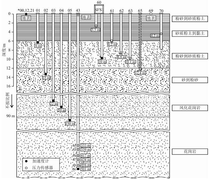 GVDA场地是美国研究机构NEES(Geoge E. Brown,Jr. Network for Earthquake Engineering Simulation)在地震较为活跃的南加州地区布设的场地地面运动研究台阵,其地理位置如图 1所示.它座落在南加州赫米特(Hemet)以东23 km,棕榈泉(Palm Springs)西南20 km的一个狭窄山谷中,距离San Jacinto断层仅7 km,距离著名的圣安德烈斯(San Andreas)断层35 km.该场地于1989年开始进行仪器观测,至今已经积累了长达25年的观测数据.GVDA场地强震观测台阵主要由沿山谷线性排列、跨度约250 m的5个地表加速度计以及从地表以下6 m至500 m布设的6个井下加速度计组成,此外,该场地还在不同深度布设了孔压传感器、深井水压传感器等,图 2给出了该场地加速度、孔压传感器的立面布置图.
