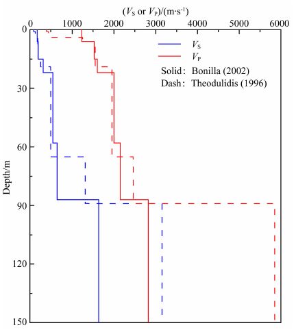 表 2 Bonilla等(2002)给出的GVDA场地速度剖面 Table 2 Shear-wave velocity profile at GVDA proposed by Bonilla et al.(2002) |