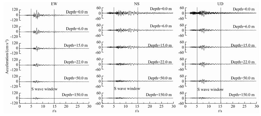 对每一次地震事件,利用位于不同深度的加速度计获取的三分量加速度时程能给出不同深度处的HVSR曲线.图 4所示为2010年7月7日5.4级地震地表和井下加速度计记录到的三分量加速度时程,从该图可清晰地看到地震动从较深处向上传播时明显的逐层放大.