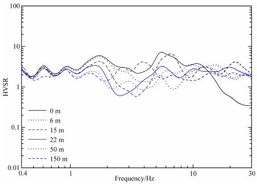 图 5为该次地震不同深度处的HVSR曲线.需要说明的是:在求取HVSR曲线时,本文采用了四个数据处理步骤: