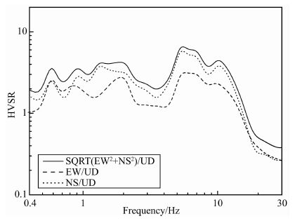(2) HVSR方法具有与传递函数类似的效果,但其与传递函数的一致性取决于场地的竖向放大,由于场地的竖向放大本身是频率相关的,因此在场地竖向放大可以忽略的频段范围内,HVSR方法可以作为传递函数研究场地效应.