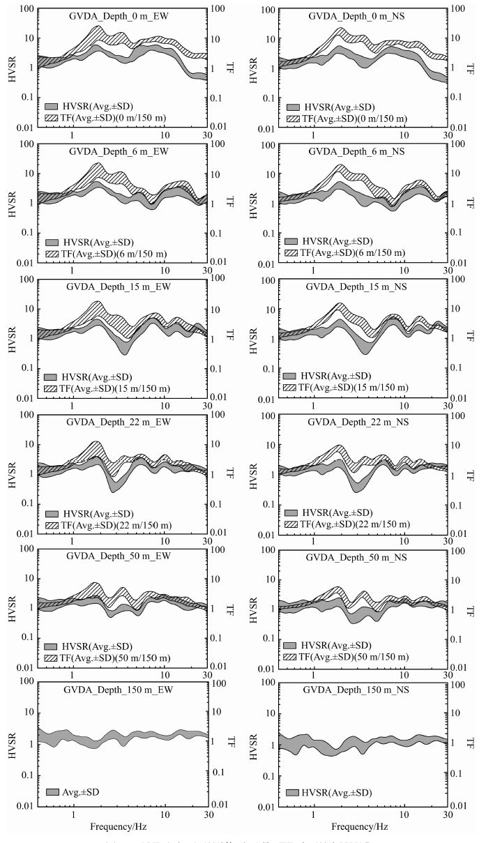考虑到分别利用EW向与NS向作为水平分量得到HVSR曲线的差异,本文对表 3所列的20次地震事件均计算了GVDA场地不同层位的HVSR曲线.虽然20次地震震级、震中距、方位角等差异较大,但各次地震得到的同一层位HVSR无论幅值还是谱形均相似,这很可能与HVSR方法能较大程度消除震源和传播路径的影响而体现场地本身的特征有关.图 7中灰色阴影给出了20次地震事件平均HVSR曲线及其加减一倍方差构成的区域,斜线阴影给出了不同层位水平向地震动与150 m处水平向地震动的S波傅氏谱谱比均值及其加减一倍方差构成的区域,该谱比即为本文定义的传递函数(TF).由图 7可获得以下几点认识: